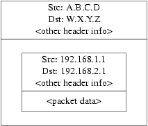 Приватные IP адреса, такие как диапазон 192.168.x не адресуются в интернет. Каждый пакет, отправляемый на 192.168.2.1 должен быть ``завернут'' в другой пакет. Исходным адресом пакета должен быть A.B.C.D, а адресом назначения W.X.Y.Z. Этот процесс называется инкапсуляцией.