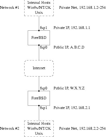 Обе сети соединены через интернет через шлюз, работающий на FreeBSD.